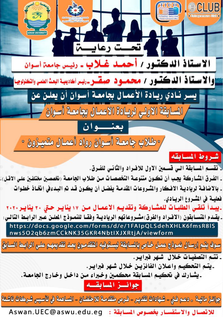 أعلن الأستاذ الدكتور أحمد غلاب محمد رئيس جامعة أسوان انه تقام المسابقة الأولي لريادة الأعمال بجامعة أسوان تحت رعاية الجامعة وأكاديمية البحث العلمي والتكنولوجيا برئاسة الأستاذ الدكتور محمود صقر رئيس الأكاديمية تحت عنوان ” طلاب جامعة أسوان رواد أعمال متميزون “