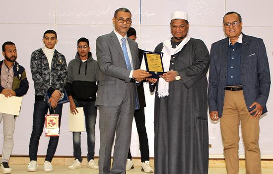 وفى ختام الحفل قامت إدارة الكلية بتكريم الفائزين، وتقديم درع الكلية لفضيلة الشيخ رمضان أبو طربوش تقديراً لمجهوده المبذول.