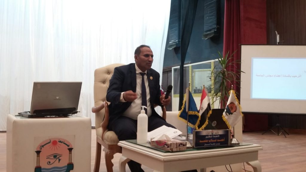 انعقد اليوم مجلس جامعة أسوان رقم (103) برئاسة الأستاذ الدكتور أحمد غلاب محمد رئيس جامعة أسوان وبحضور الدكتور أيمن عثمان نائب رئيس الجامعة للدراسات العليا والبحوث والدكتور مجدي محمد علي نائب رئيس الجامعة لخدمة المجتمع وتنمية البيئة وبحضور مستشاري رئيس الجامعة وعمداء الكليات .افتتح أعمال المجلس الدكتور أحمد غلاب محمد رئيس الجامعة بالترحيب بالحضور أعضاء المجلس .