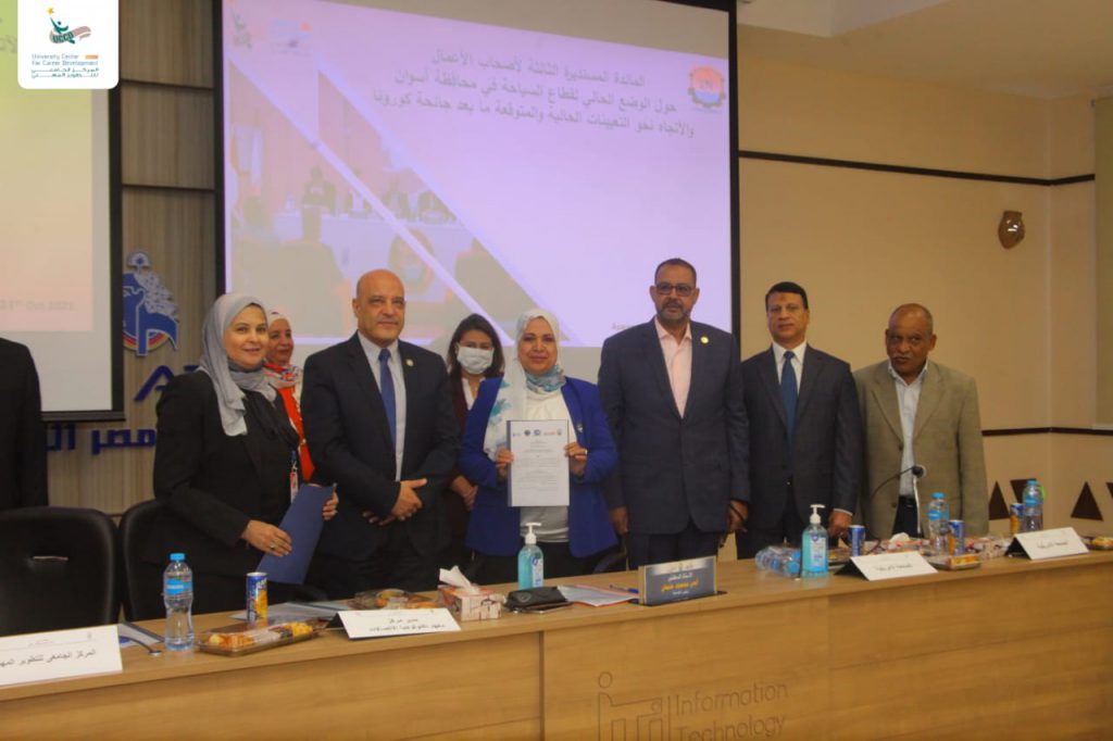 وأكد الدكتور/ أيمن عثمان رئيس جامعة أسوان علي أهمية قطاعات الجامعة الثلاثة التعليم والبحث العلمي وخدمة المجتمع وتنمية البيئة وأن الجامعة من خلال مركز التطوير المهنى قامت بتنفيذ فاعليات المائدة المستديرة وذلك تحت عنوان الوضع الحالي لقطاع السياحة في محافظة أسوان والإتجاهات المستقبلية وذلك لبحث تداعيات جائحة كورونا على قطاع السياحة والعمل علي إيجاد آليات العمل والتوظيف ما بعد كورونا بقطاع السياحة وربط الخريجين بسوق العمل والعمل علي تقديم فرصة العمل لطلابنا وخريجينا لمواكبة التطورات وليكونوا مؤهلين لمواكبة سوق العمل دائما”