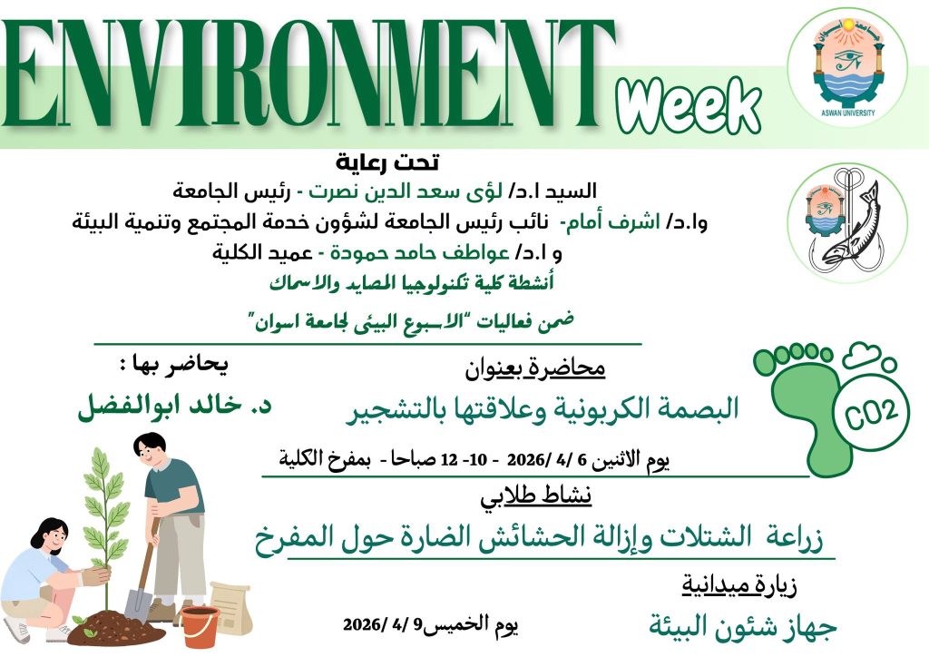 فعاليات الأسبوع البيئي لجامعة أسوان / الأخبــــار / By zeinab تحت رعاية السيد ا.د/ لؤى سعد الدين نصرت – رئيس الجامعة وا.د/ اشرف أمام- نائب رئيس الجامعة لشؤون خدمة المجتمع وتنمية البيئة و ا.د/ عواطف حامد حمودة – عميد الكلية ندعو سيادتكم للمشاركة في أنشطة الكلية