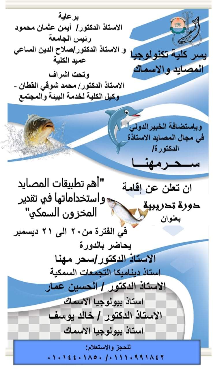 تحت رعاية الأستاذ الدكتور / أيمن عثمان – رئيس الجامعة والأستاذ الدكتور/ صلاح الدين الساعي – عميد الكلية وتحت اشراف الاستاذ الدكتور/ محمد شوقي القطان – وكيل الكلية لخدمة البيئة والمجتمع تعلن كلية تكنولوجيا المصايد والاسماك عن إقامة دورة تدريبية بعنوان ” أهم تطبيقات المصايد واستخداماتها في تقدير المخزون السمكي ” في الفترة من 20-21 ديسمبر ، وسوف يتم بإلقاء المحاضرة الأستاذ الدكترو/ سحر مهنا – استاذ ديناميكا التجمعات السمكية ، والاستاذ الدكتور/ الحسين عمار – أستاذ بيولوجيا الاسماك ، والاستاذ الدكتور/ خالد يوسف – أستاذ بيولوجيا الاسماك.