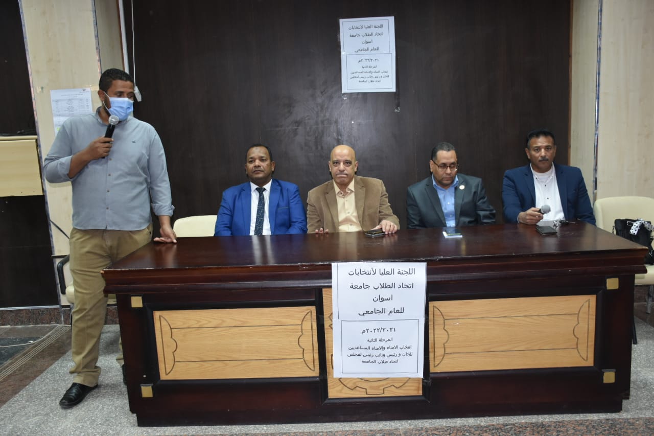 وجرت عملية الانتخاب على رئيس اتحاد طلاب الجامعة ونائبه بالاقتراع من بين رؤساء ونواب الاتحادات الطلابية بكليات جامعة اسوان، وذلك بحضور الدكتور/ أيمن عثمان – رئيس الجامعة ورئيس اللجنة العليا المشرفة علي انتخابات الاتحادات الطلابية والتي تضم رئيس الجامعة رئيسا والدكتور/ احمد عبد الصادق محمد – استاذ مساعد بكلية العلوم عضوا والدكتور ايمن احمد عبدالغفار- وكيل كلية الحقوق لشؤن التعليم والطلاب عضوا وخالد محمد اسماعيل – امين عام الجامعة المساعد للشؤن الادارية عضوا وحاتم يسري يوسف – مدير عام رعاية الطلاب بالجامعة عضوا وفؤاده ابراهيم توفيق قائم بعمل مدير عام مكتب رئيس الجامعة عضوا ومكرم خوجلي رمضان مدير ادارة الاسر والاتحاد عضوا واسلام يوسف عابد منسق الجامعة لشؤن الإتحادات الطلابية عضوا ونبيه محمد نبيه طالب عضو طلابي ومودة حاتم سليمان طالبة عضو طلابي.