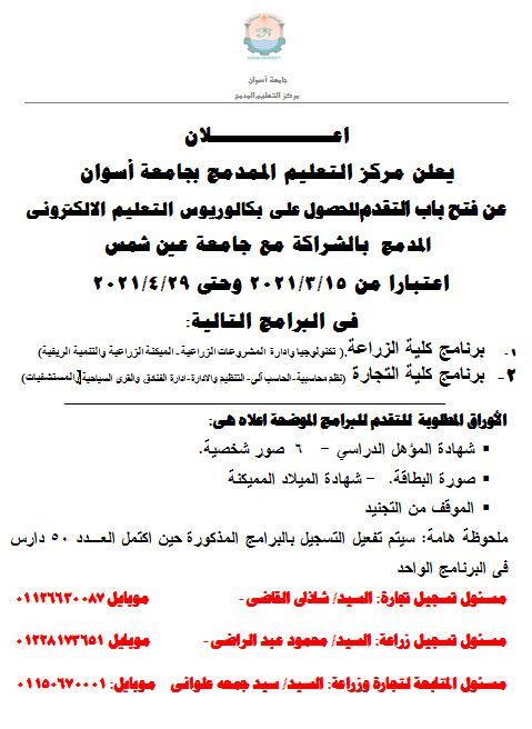 يعلن مركز التعليم المدمج بجامعة أسوان عن فتح باب التقديم للحصول علي بكالوريوس التعليم الإلكتروني / الأخبــــار / By zeinab