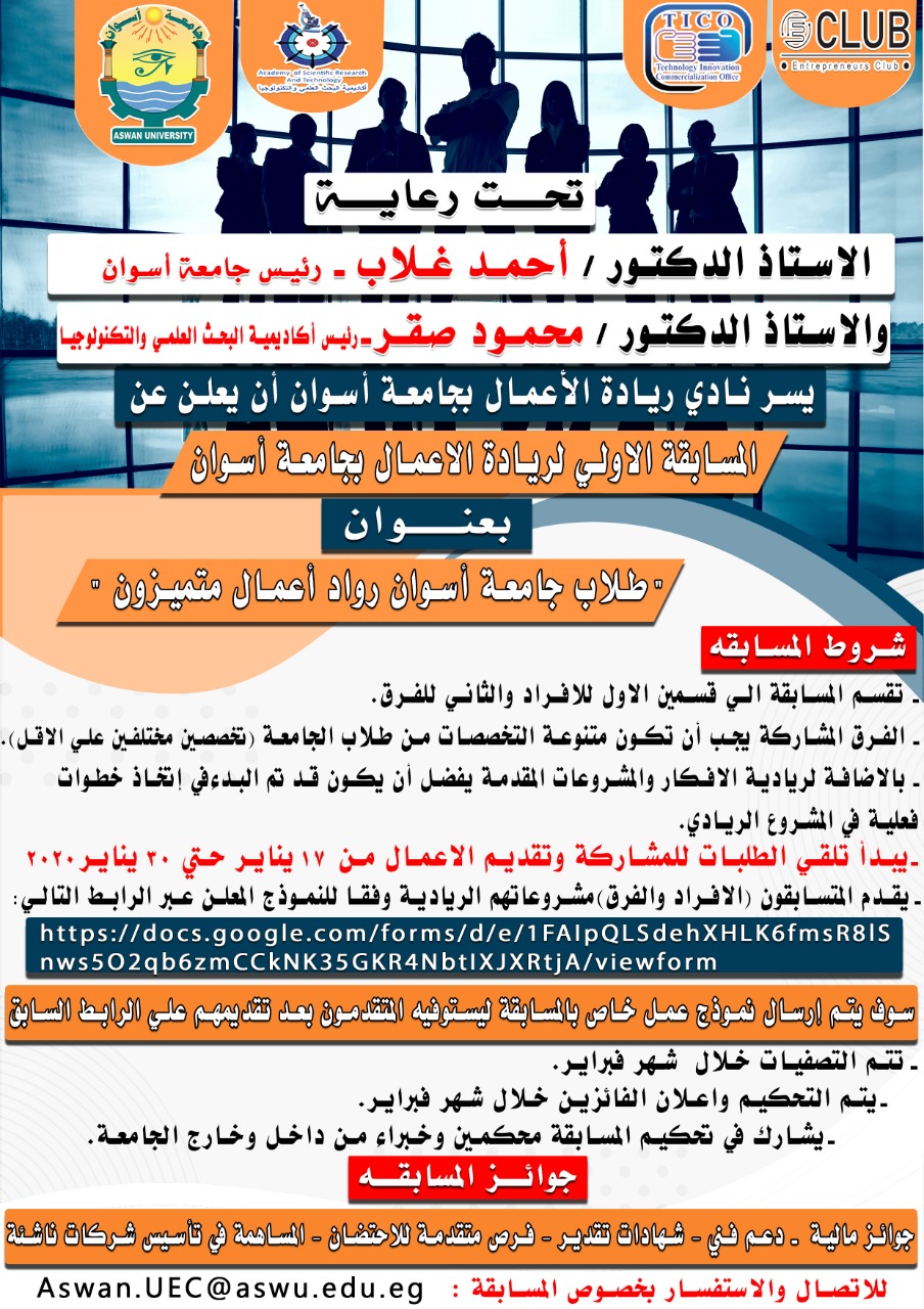 أعلن الأستاذ الدكتور أحمد غلاب محمد رئيس جامعة أسوان انه تقام المسابقة الأولي لريادة الأعمال...