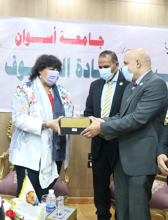 وأضاف “غلاب” انه علي هامش افتتاح فاعليات معرض الكتاب بجامعة أسوان الذي افتتاحته الدكتوره/ ايناس عبدالدايم – وزيرة الثقافة والذي تستمر فاعلياته حتي يوم 31 ديسمبر الجاري وذلك بحضور اللواء أشرف عطية محافظ أسوان والأستاذ الدكتور/ أحمد غلاب محمد – رئيس جامعة أسوان كرمت وزيرة الثقافة قيادات الجامعة وعلي رأسها الدكتور أحمد غلاب رئيس الجامعة تقديرا لدوره البارز في تطوير الجامعة من منشاءات جديدة من ملاعب رياضية واستاد الجامعة ومباني تعليمية تخدم المنظومة التعليمية باسوان ومدي الجهود المبذلة والتعاون المثمر في اقامة معرض الكتاب بالجامعة لهذا العام في ظل اتخاذ كافة الإجراءات الاحترازية والوقاءية لمواجهة فيروس كورنا المستجد والتشديد علي تطبيقها .