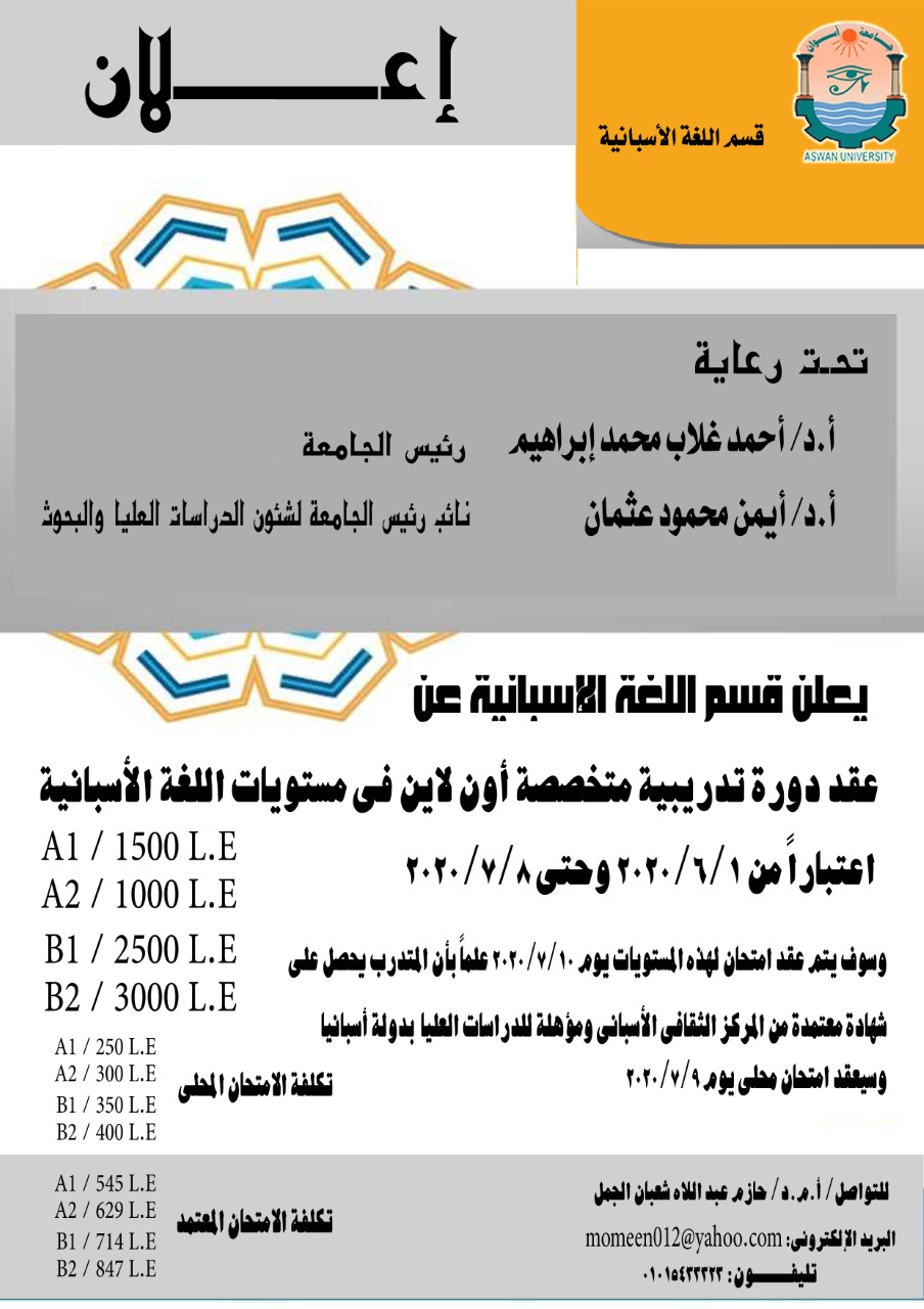 تحت رعاية الأستاذ الدكتور / أحمد غلاب محمد رئيس جامعه أسوان، والأستاذ الدكتور/ أيمن محمود عثمان – نائب رئيس الجامعة لشئون الدراسات العليا والبحوث ، يعلن قسم اللغة الأسبانية بكلية الالسن عن عقد دورة تدريبيه اولاين متخصصة في مستويات اللغة الأسبانية اعتباراً من 1/6/2020 وحتي 8/7/2020 وسوف يعقد إختبار لهذه المستويات يوم الجمعة الموافق 10 يوليو 2020، بحيث يحصل المتدرب على شهادة معتمدة من المركز الثقافى الإسبانى ومؤهلة للدراسات العليا بدولة إسبانيا.